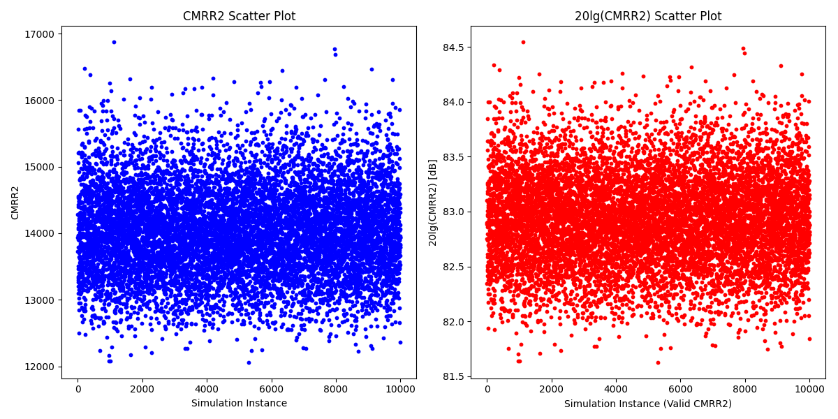 5.计算分贝值并绘制散点图:将每个 \(\text{CMRR}_2\) 转换成分贝值,即 \(20 \log ( \text{CMRR}_2)\),生成 10000 个 \(\text{CMRR}_2\)和 \(20 \log(\text{CMRR}_2)\)的散点图,统计相关数据,展示结果分布。