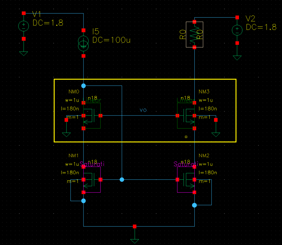 参照上学期的实验电路,选取\(I_{REF}\)=100uA,作为电流源电流大小,\(\frac{W}{L}\)=\(\frac{1um}{180nm}\),设计电路如图所示