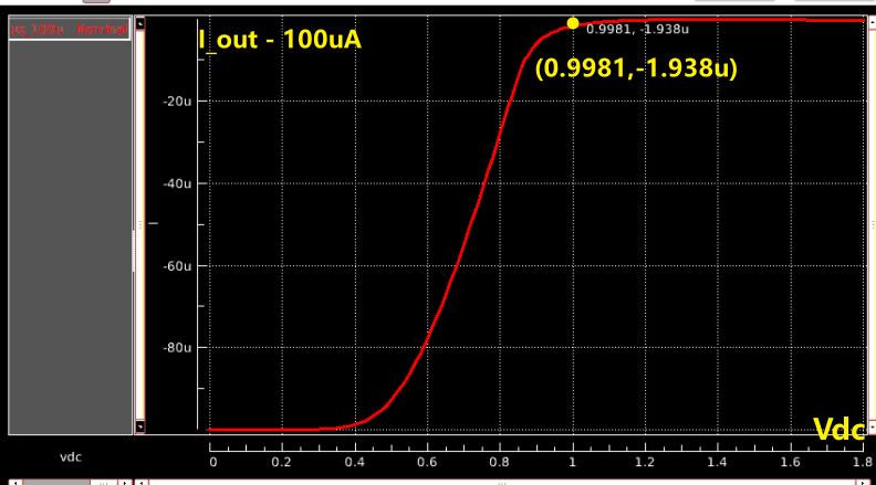 - 对题目要求的\(V_{B}\)(在图2中为v0,也即vdc),进行DC扫描,以\(I_{out}-100uA\)作为输出,参数设置和仿真图像分别如图3和图4