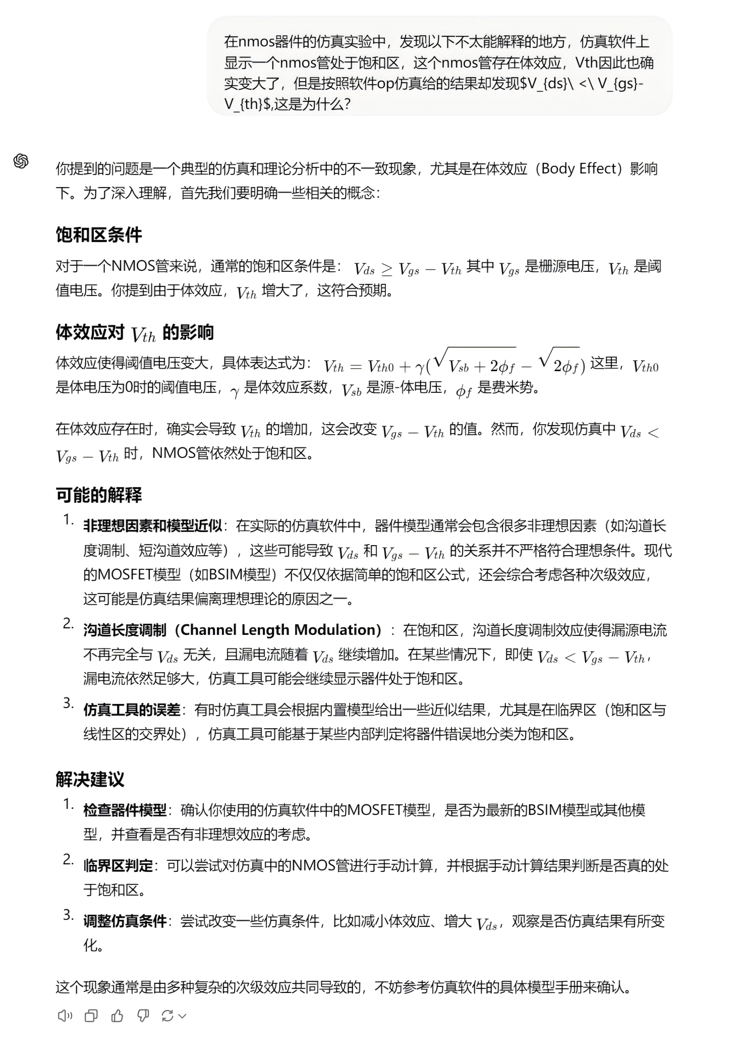 因此,\(V_{B}\)的上限初步估计在1.5V至1.6V之间,与理论计算相比偏差较大,这是容易理解的,由于体效应的存在导致图中黄色方框里的mos管阈值电压增高,即 \(V_{TH_{3}}\) 升高,结合(三)中的不等式,容易得到\(V_{B}\)的上限会增高。当然也很大程度上也是因为仿真的器件参数跟题目参数不一样导致的。